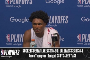 体育资讯4月27日讯 在今天结束的一场季后赛中,火箭以115-96战胜湖人,大比分1-3落后。赛后,火箭球员阿门·汤普森出席了新闻发布会。以下是完整版采访内容。
