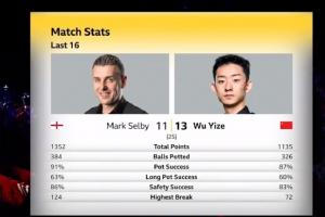 本场比赛,吴宜泽在数据方面全面落后于塞尔比,但最终胜者是吴宜泽。数据对比如下,塞尔比在前,吴宜泽在后。