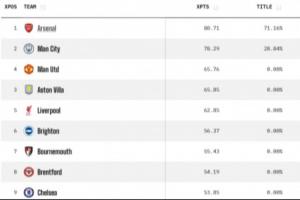 据OPTA官网数据,阿森纳、曼城、维拉、曼联以及利物浦以绝对优势排在前五,切尔西概率仅为1.45%。