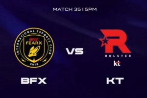 中期KT中野压制强势扫图!14分钟野区团战虽然Raptor赵信开大强行击杀掉了Cuzz巨魔但是最终还是KT的1换2!随后KT先锋团再强杀Daystar冰鸟,拆掉上一塔之后拉开3K多经济差!BFX则是拿下先锋之后强拆KT中一塔,KT换掉了下一塔+听牌龙!21分钟中路团Kellin巴德金两个,但是正面团仍然是KT的1换2!