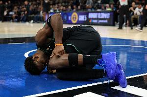 季后赛G4次节,爱德华兹在防守卡梅隆·约翰逊冲筐时落地膝盖受伤,随后被搀扶离场。
